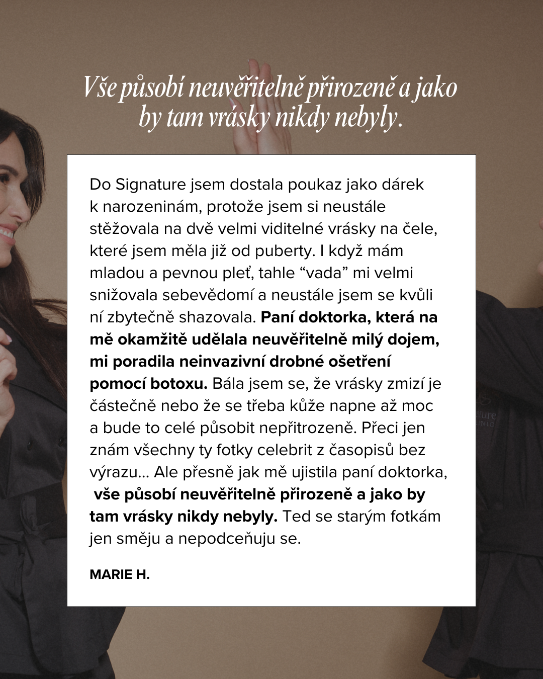 Tohle je naše hlavní zásada: Nikdy z vás neuděláme někoho jiného. Naše práce je o tom, aby vás zrcadlo konečně zase poznalo – a vy jste se vrátila sama k sobě. Ne nová tvář. Jen ta vaše – odpočatá, projasněná, sebevědomá.